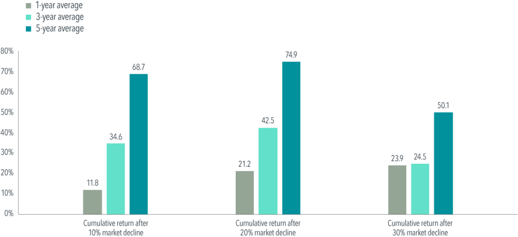 Pain you may feel now reflects markets setting prices such that expected returns are always positive. Exhibit 1 below illustrates that market returns following downturns generally have been positive. When we examine US equity returns following downturns of 10%, 20%, or even 30%, we see one-, three-, and five-year cumulative returns that are positive on average. Viewed in annualized terms across five years, returns after a 20%